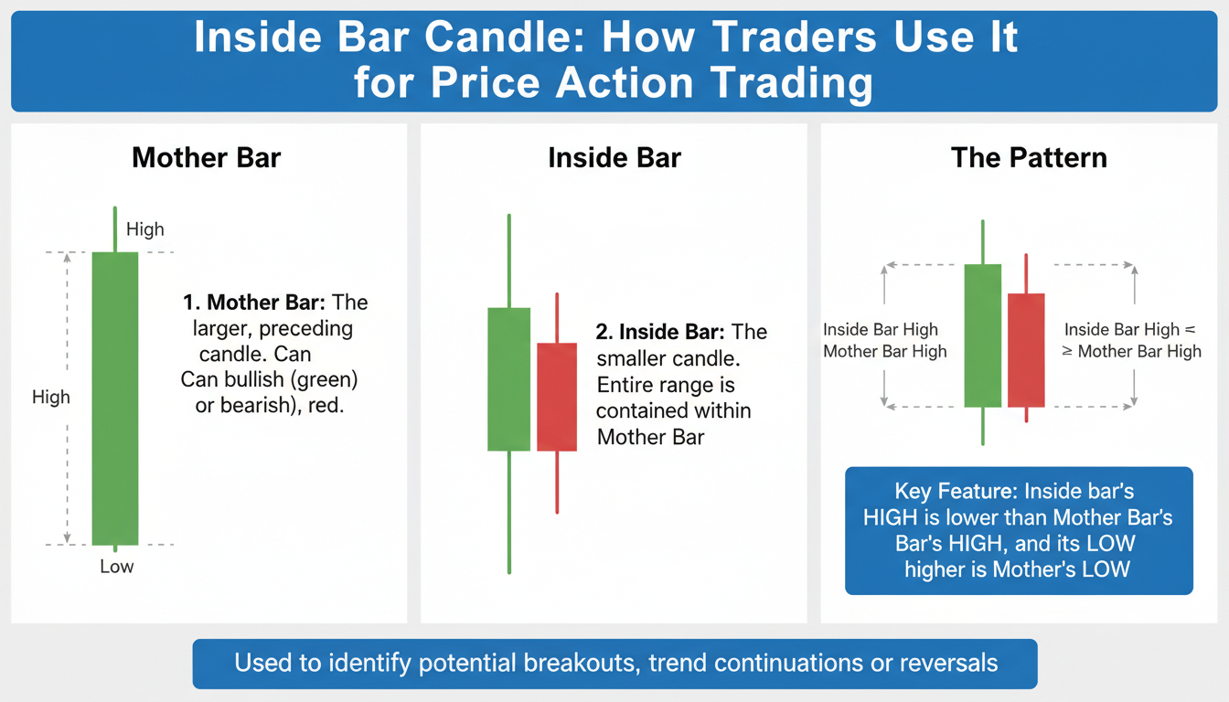 Inside Bar Candle: How Traders Use It for Price Action Trading Lisa Howard February 9, 2026 An Inside Bar candle pattern signals a moment of consolidation—when the latest bar (price range) sits completely within the prior Read More »