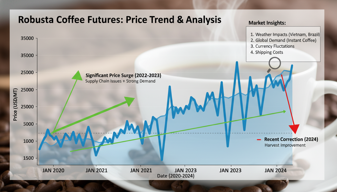 Robusta Coffee Futures: Latest Price Action and Market Trends Margaret Martin February 12, 2026 The latest price action in robusta coffee futures shows a notable pullback from 2025 highs, with current levels around $3,587 Read More »